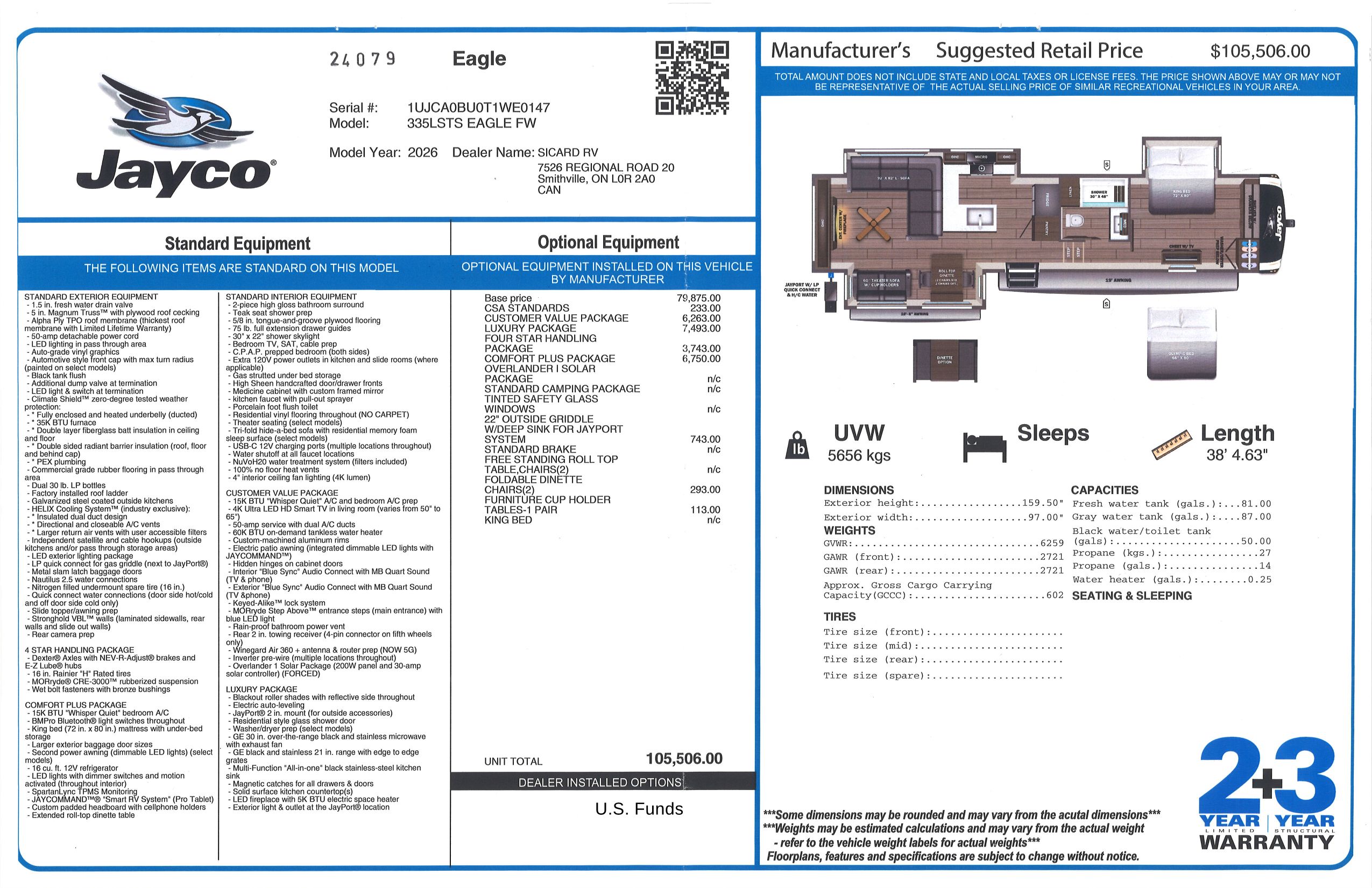 Introducing the 2026 Eagle 335LSTS, made by Jayco. The 335LSTS offers features, comforts and livability for extended trips or weekend vacation. This fifth wheel sleeps up to 4 people.