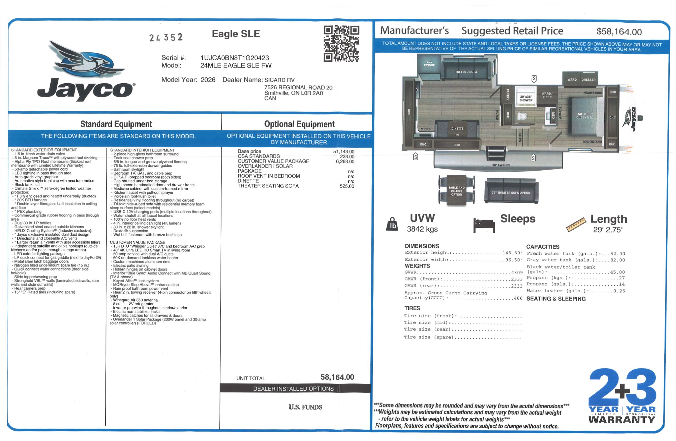 Introducing the 2026 Eagle SLE 24MLE, made by Jayco. The Eagle SLE 24MLE is a great way to escape the ordinary, relax, and enjoy family and friends. This fifth wheel sleeps up to 5 people. Inside this Eagle SLE 24MLE, you will find a four seat bench dinette that converts into an additional sleeping space when required. Included with this Eagle SLE 24MLE, you will also receive the Theater Seat Sofa option. All Eagles come with a 2 year limited warranty and a 3 year structural warranty, providing you with peace of mind against any defects. Embrace the RV lifestyle and unlock a world of adventure with the Eagle SLE 24MLE from Sicard RV.