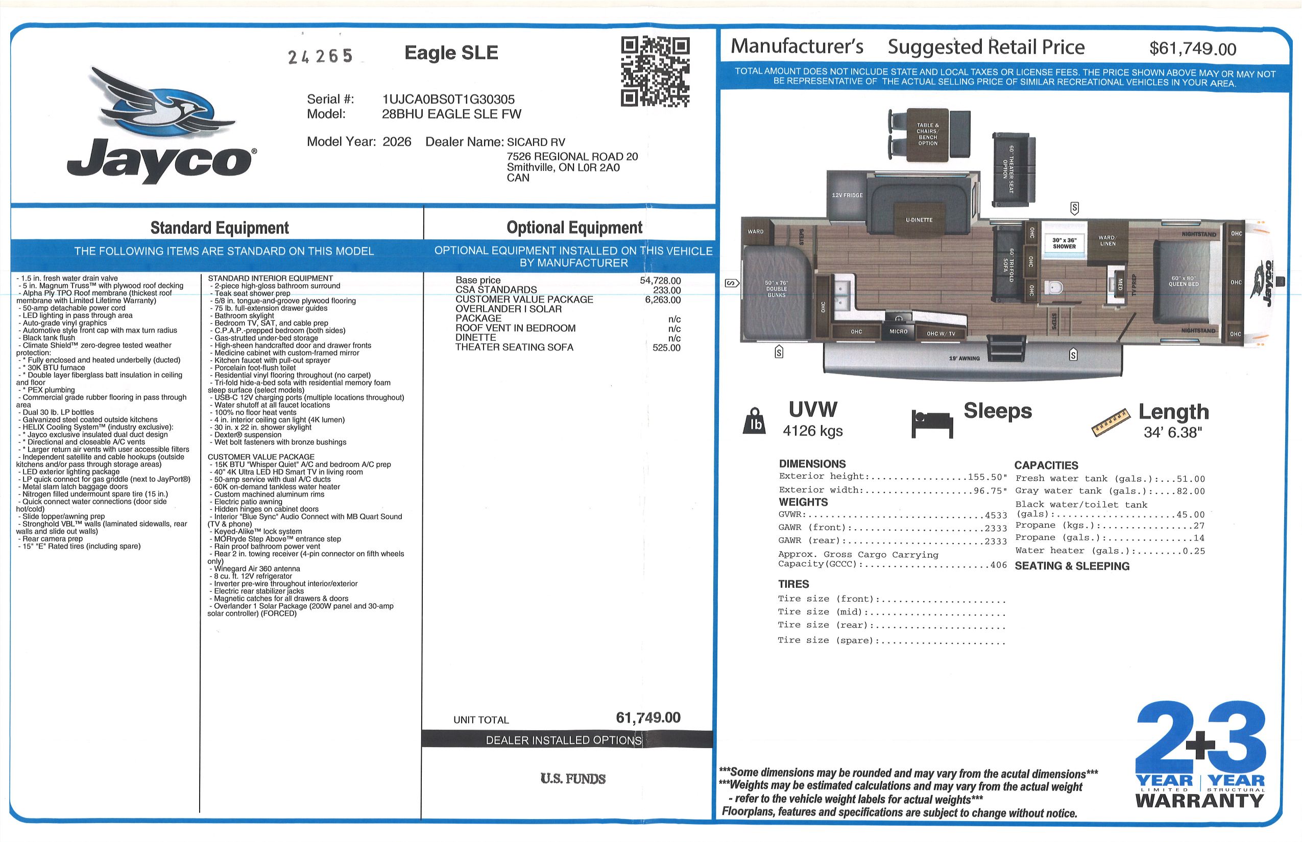 Inside this Eagle SLE 28BHU, you will find rear room with double bunk beds providing plenty of extra sleeping space. Included with this Eagle SLE 28BHU, you will also receive the Theater Seating Sofa option. All Eagles come with a 2 year limited warranty and a 3 year structural warranty, providing you with peace of mind against any defects.