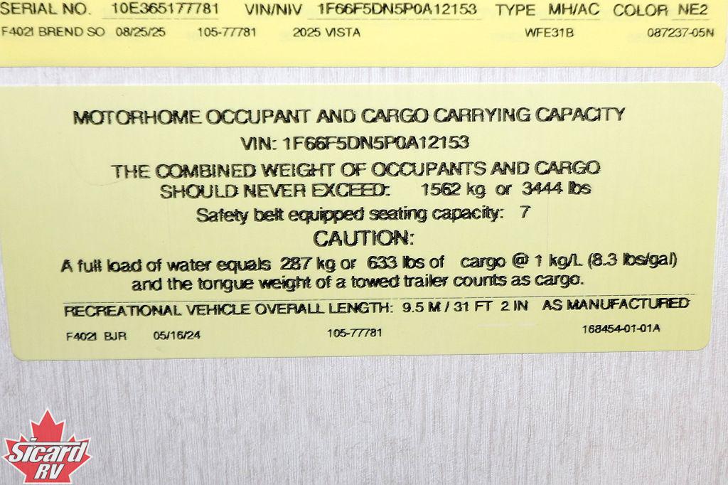 The Vista 31B rides on a Ford F53 chassis, powered by a 335HP gas engine with a 6 speed automatic transmission w/overdrive.