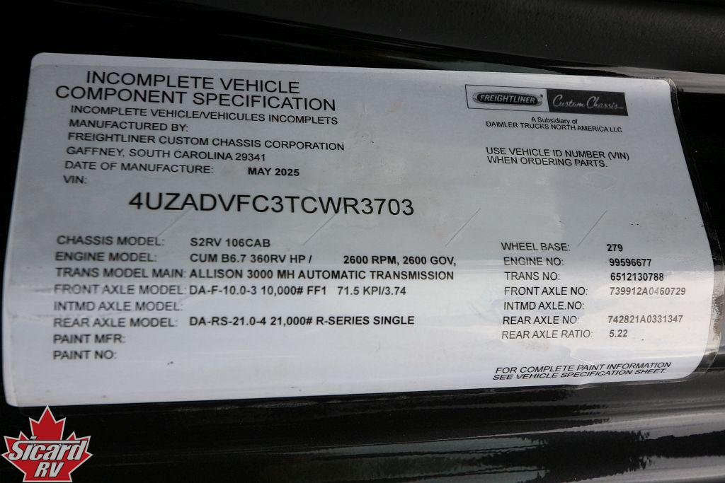 The Seneca 37M rides on a Freightliner S2RV Plus chassis, powered by a Cummins ISB 6.7L 360HP engine with an Allison 3000 MH automatic transmission.