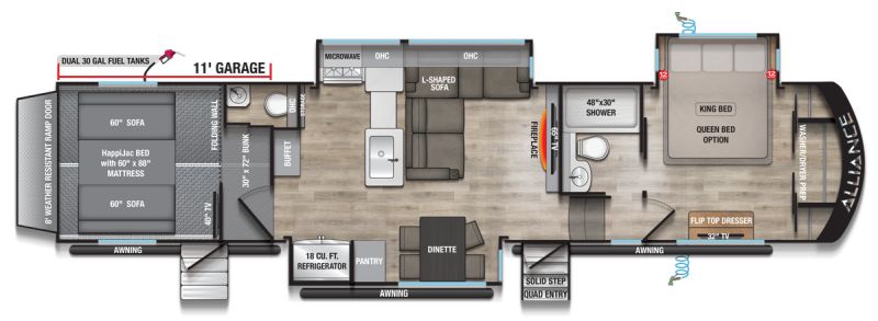 Introducing the 2026 Valor 37V11, from Alliance. The Valor 37V11 offers the ability to sleep in comfort and bring all the toys along for the ride. This toy hauler fifth wheel sleeps up to 8 people.