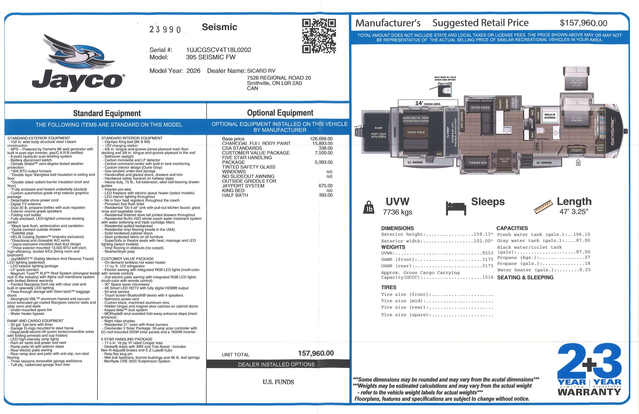 Inside this Seismic 395, you will find a power lift bunk in the cargo bay providing additional sleeping options when needed. Included with this Seismic 395 is the Outside Griddle for JayPort System option. All Seismics come with a 2 year limited warranty and a 3 year structural warranty, providing you with peace of mind against any defects.