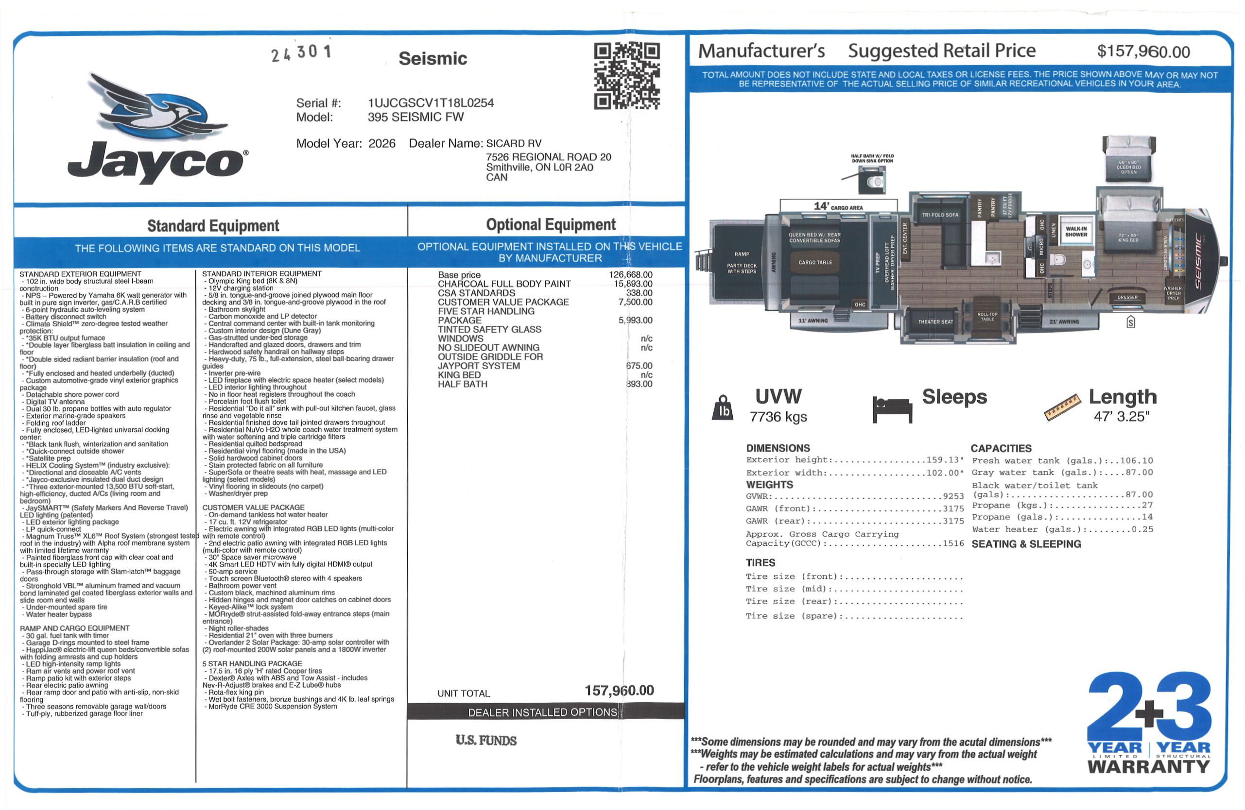 Inside this Seismic 395, you will find a power lift bunk in the cargo bay providing additional sleeping options when needed. Included with this Seismic 395 is the Outside Griddle for JayPort System option. All Seismics come with a 2 year limited warranty and a 3 year structural warranty, providing you with peace of mind against any defects.