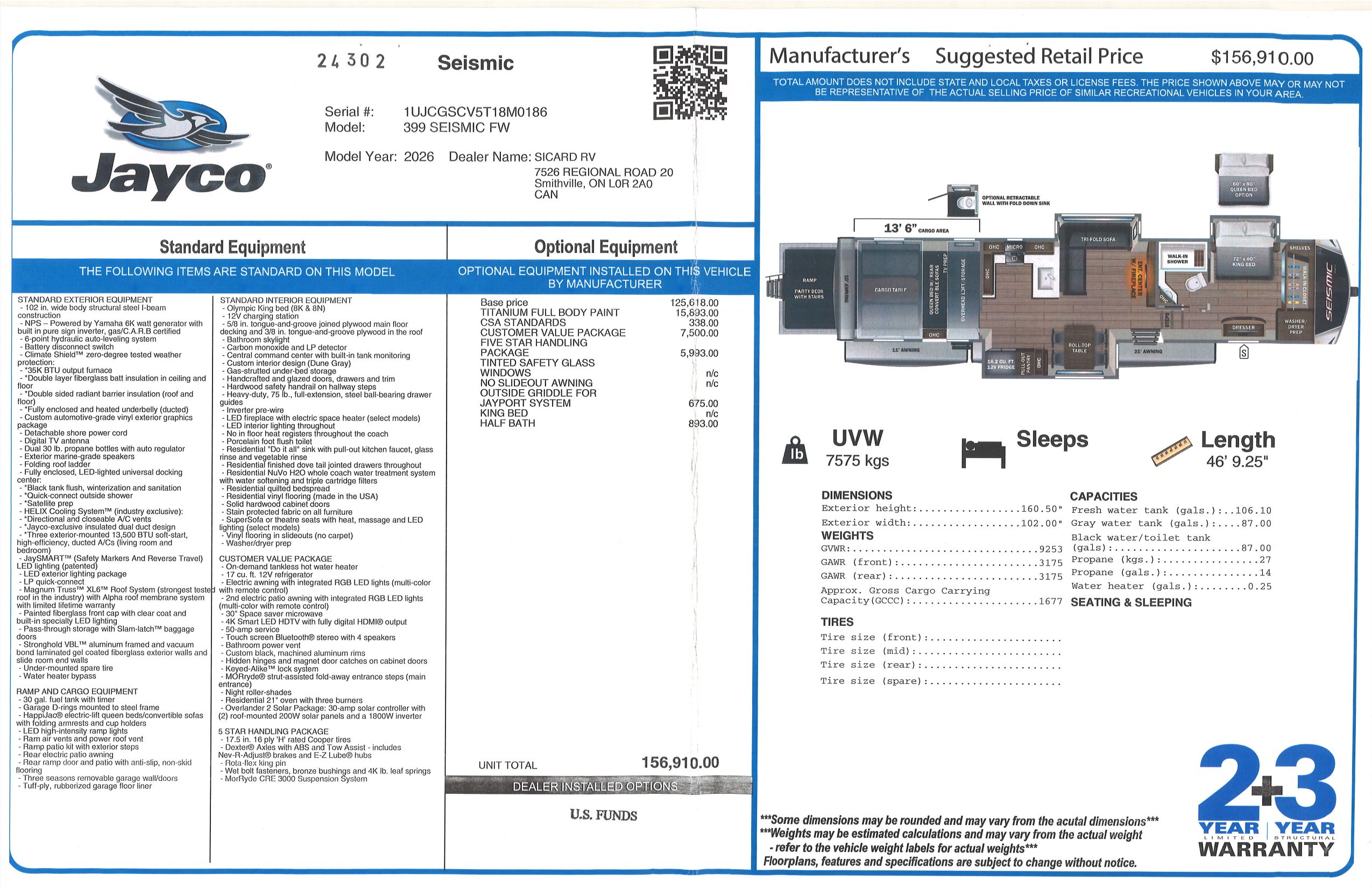 Inside this Seismic 399, you'll find a power lift bunk in the cargo bay providing additional sleeping options when needed. Included with this Seismic 399 is the Outside Griddle for JayPort System option. All Seismics come with a 2 year limited warranty and a 3 year structural warranty, providing you with peace of mind against any defects.