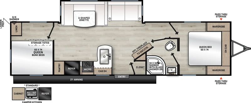 Inside the Aurora 29TQS, you will find a rear bunk room with double bunk beds providing extra sleeping options when required. Included with this Aurora 29TQS is the Exterior Sport and Travel Package option. All Auroras come with a 1 year manufacturer limited warranty, providing you with peace of mind against any defects.