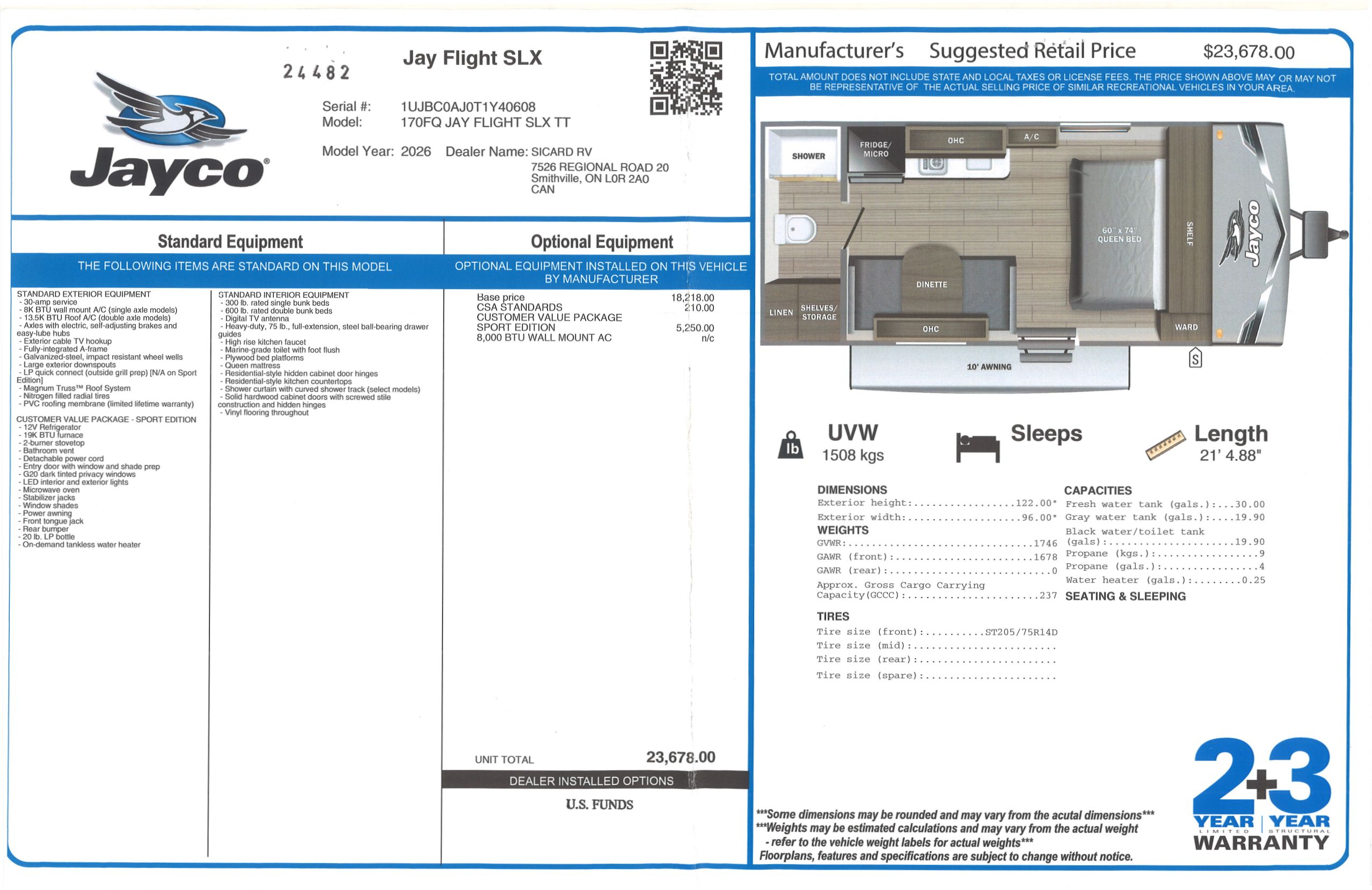 Introducing the 2026 Jay Flight SLX 170FQ, made by Jayco. The Jay Flight SLX 170FQ is a great way to introduce your family to the RV lifestyle. This travel trailer sleeps up to 3 people. Inside this Jay Flight SLX 170FQ, you will find a bench dinette that converts into a bed providing additional sleeping space when required. Included with this Jay Flight SLX 170FQ, you will also receive the Customer Value Package option. All Jay Flight SLXs come with a 2 year limited warranty and a 3 year structural warranty, providing you with peace of mind against any defects. Embrace the RV lifestyle and unlock a world of adventure with the Jay Flight SLX 170FQ from Sicard RV.