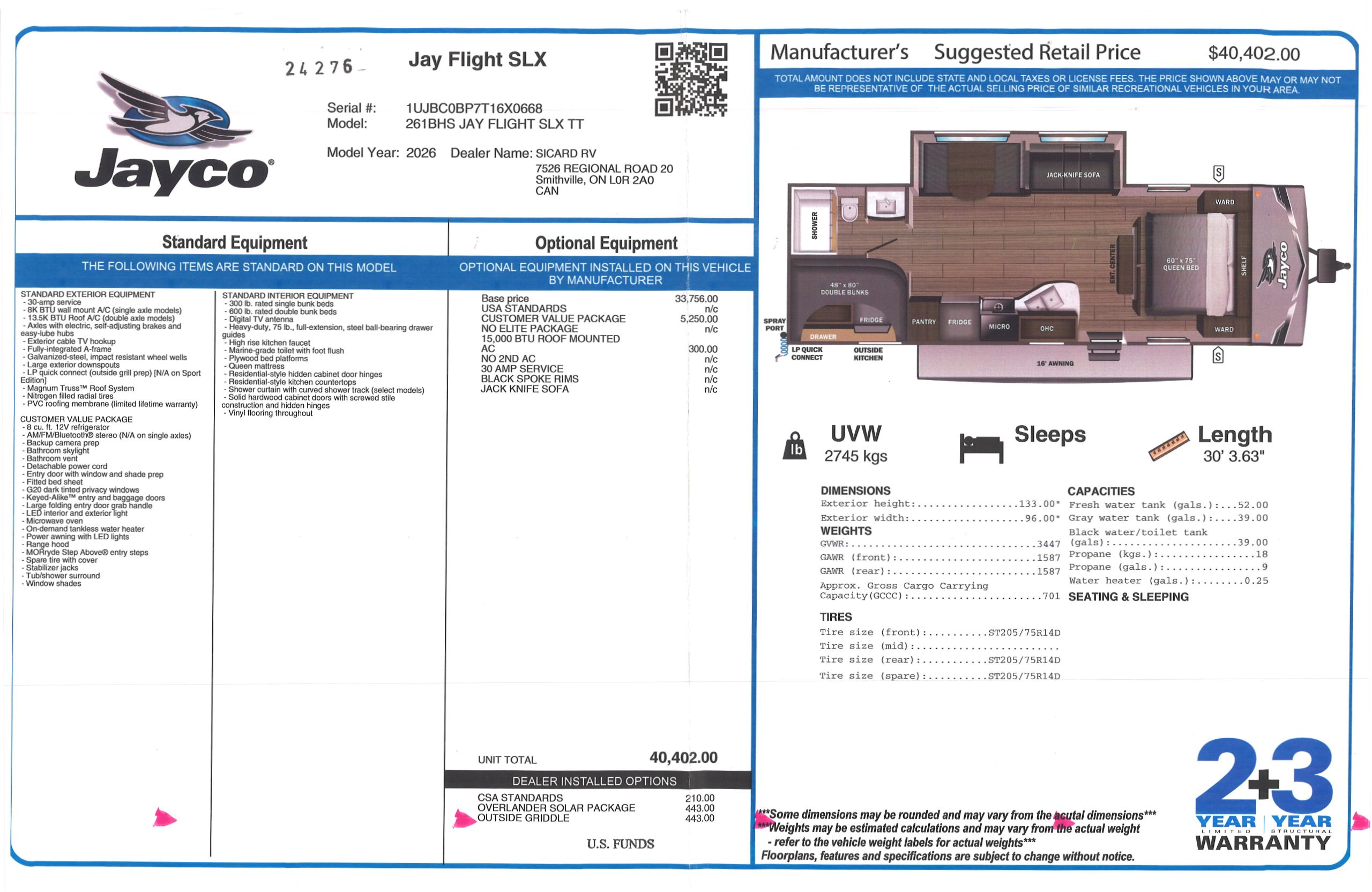 Inside this Jay Flight SLX 261BHS, you will find double bunk beds that give you plenty of extra sleeping space. Included with this Jay Flight SLX 261BHS, you will also receive the Overlander Solar Package option. All Jay Flight SLXs come with a 2 year limited warranty and a 3 year structural warranty, providing you with peace of mind against any defects.