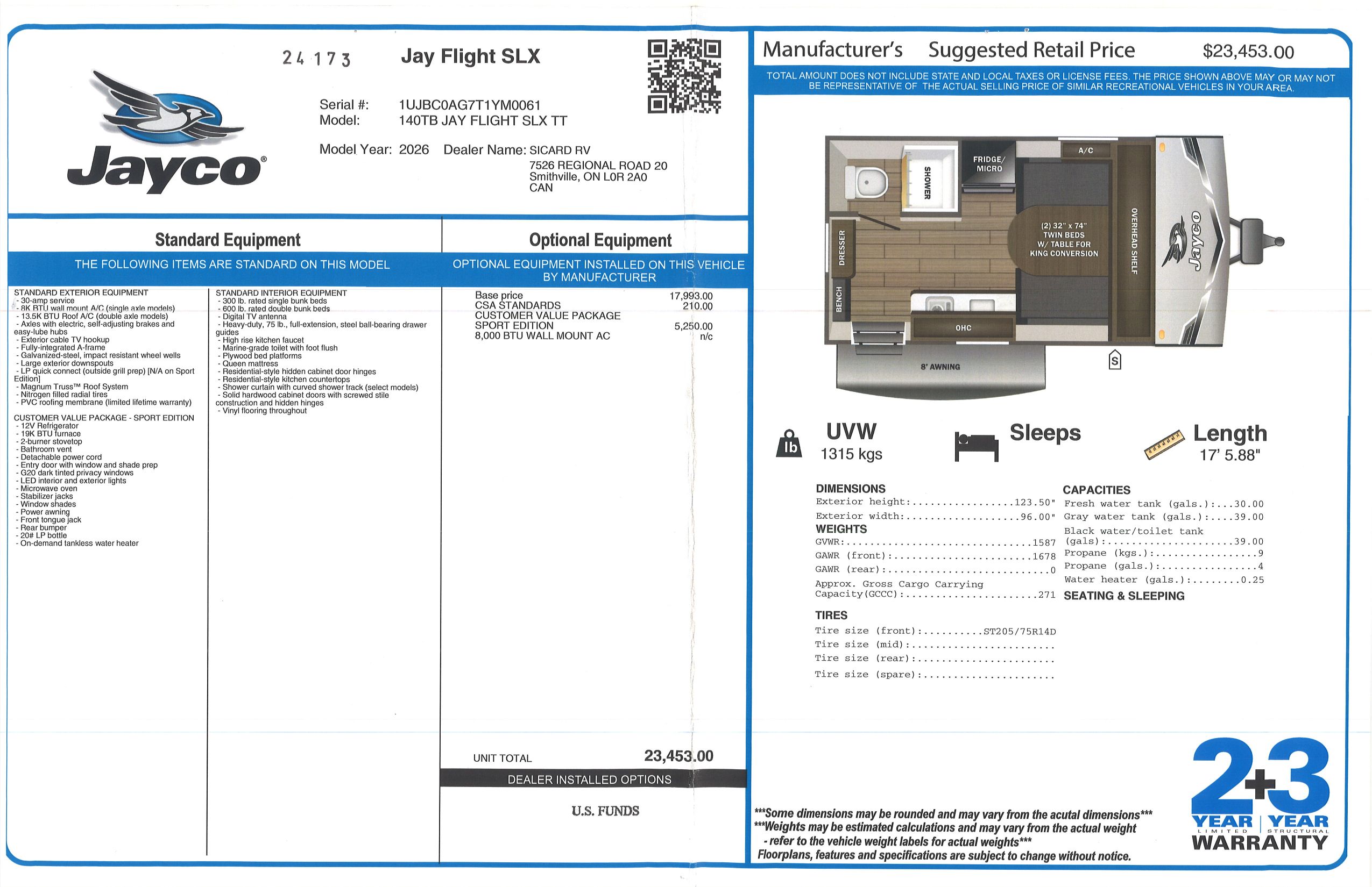 Introducing the 2026 Jay Flight SLX 140TB, made by Jayco. The Jay Flight SLX 140TB provides everything you need for your travels with lighter tow weights. This travel trailer sleeps up to 3 people. Inside this Jay Flight SLX 140TB, you will find a bench dinette that converts into a bed providing a sleeping space when required. Included with this Jay Flight SLX 140TB, you will also receive the Customer Value Package Sport Edition option. All Jay Flight SLXs come with a 2 year limited warranty and a 3 year structural warranty, providing you with peace of mind against any defects. Embrace the RV lifestyle and unlock a world of adventure with the Jay Flight SLX 140TB from Sicard RV.