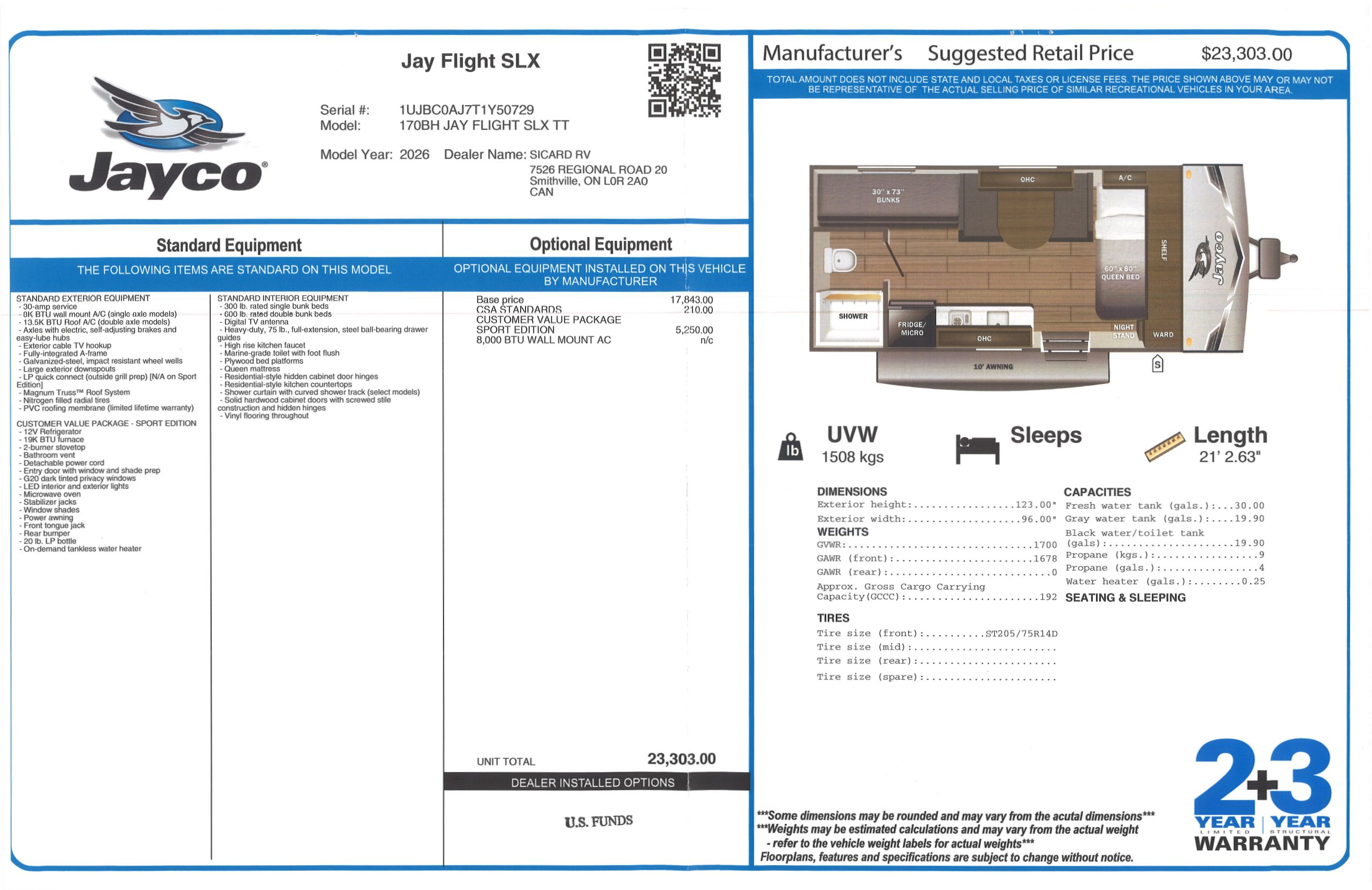 Inside this Jay Flight SLX 170BH, you will find bunk beds that give you plenty of extra sleeping space. Included with this Jay Flight SLX 170BH, you will also receive the Customer Value Package - Sport Edition option. All Jay Flight SLXs come with a 2 year limited warranty and a 3 year structural warranty, providing you with peace of mind against any defects.