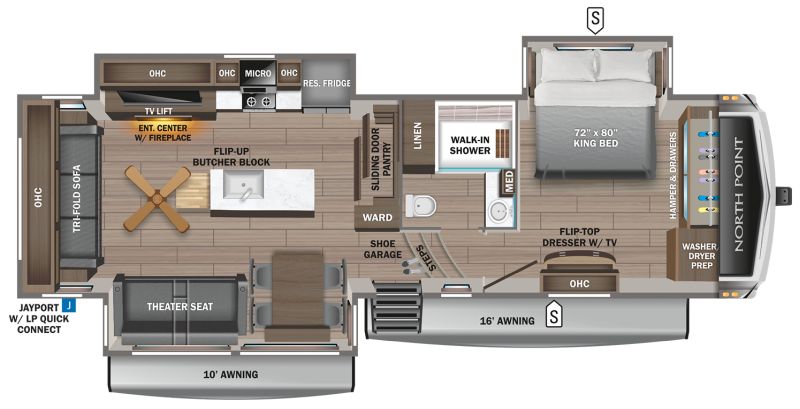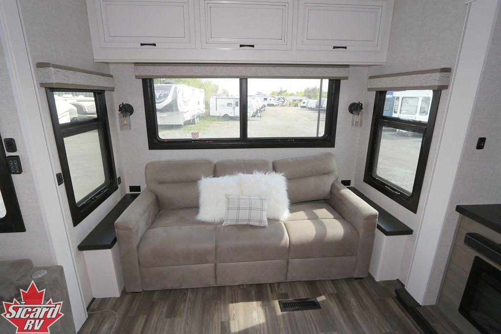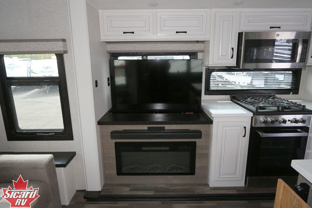 Inside the North Point 310RLTS, you will find a tri-fold sofa that converts into a bed providing additional sleeping space when required, as well as a fireplace.