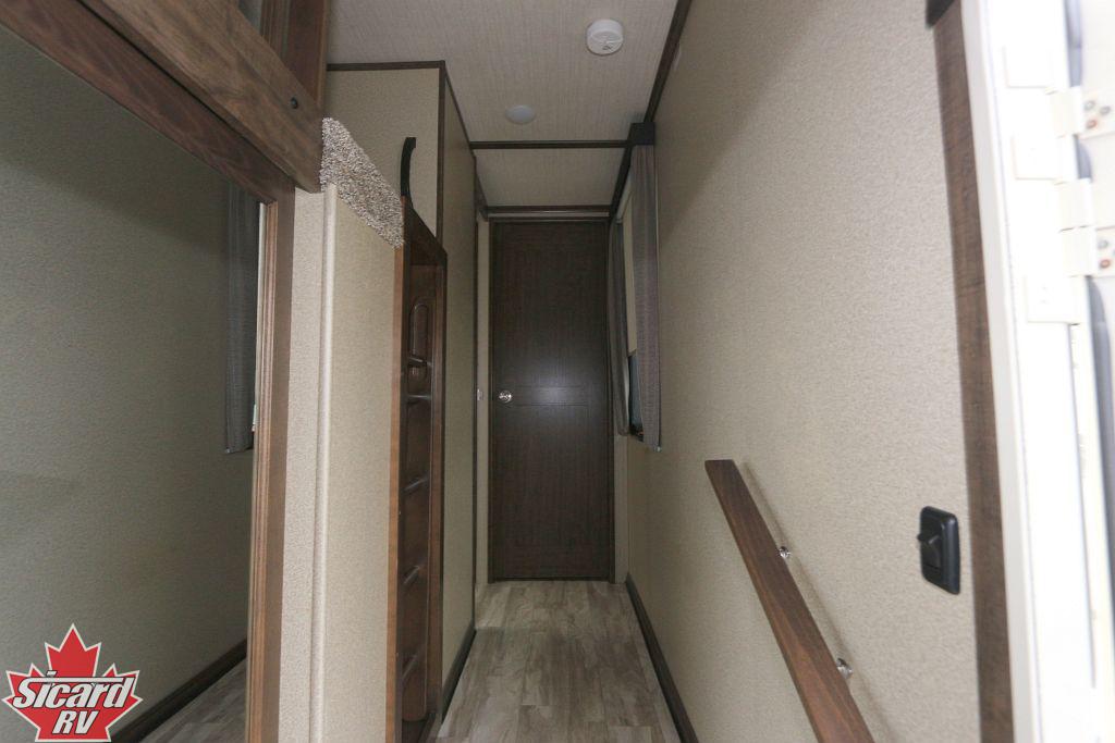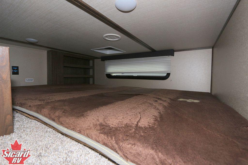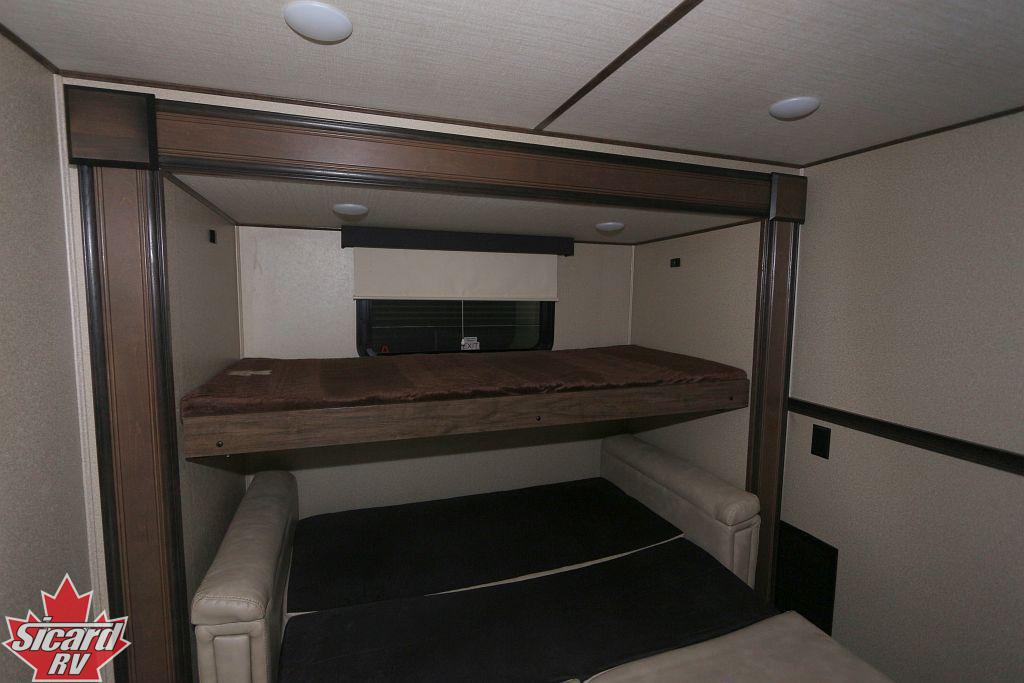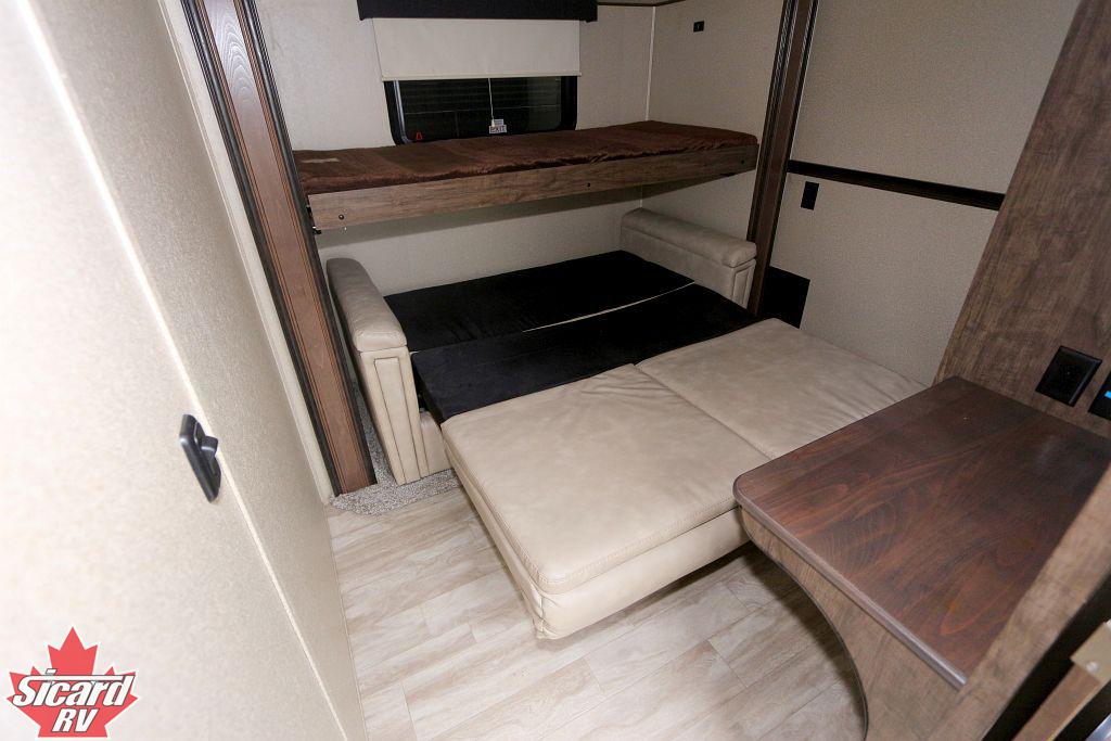 Inside the Solitude 377MBS, you will find a mid bunk room with tri-fold sofa bed, as well as a loft sleeping area above the mid bunk room.