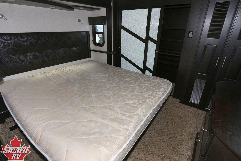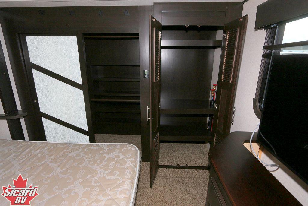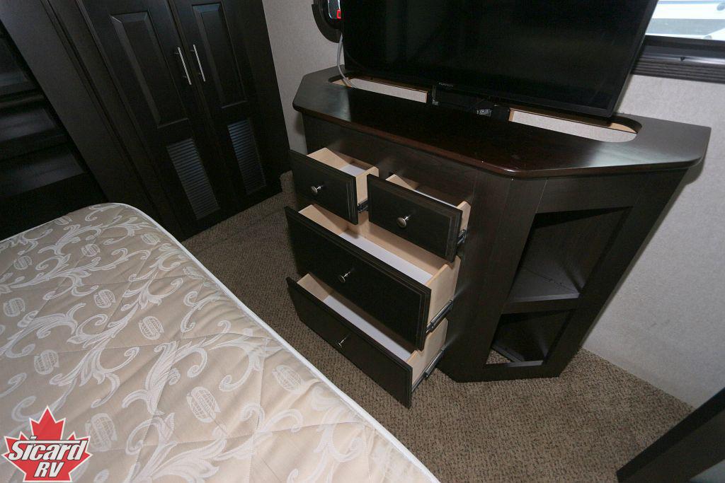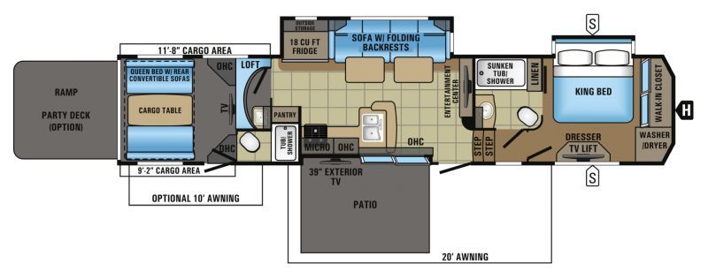 Inside the Seismic 4212, you will find a spacious interior living area in the middle of the unit, as well as a rear cargo bay with a power lift bunk and T.V.