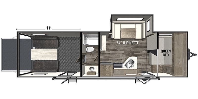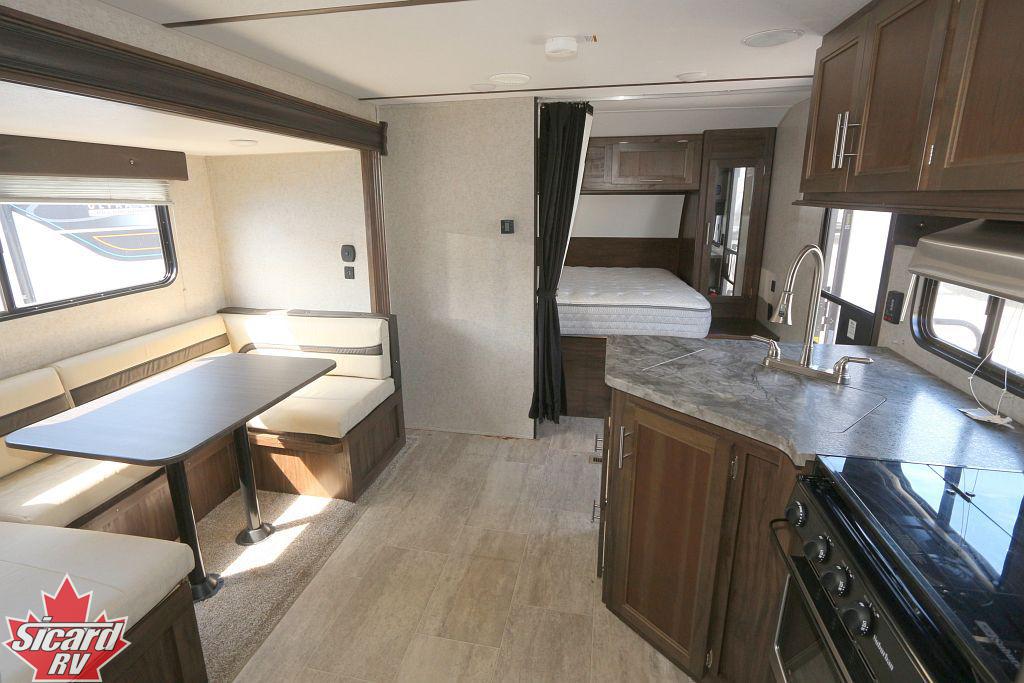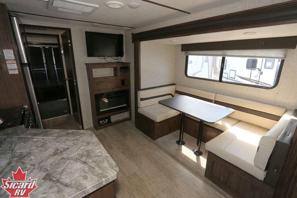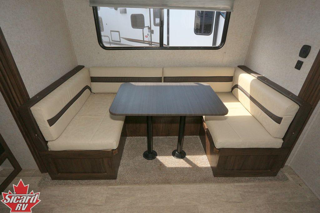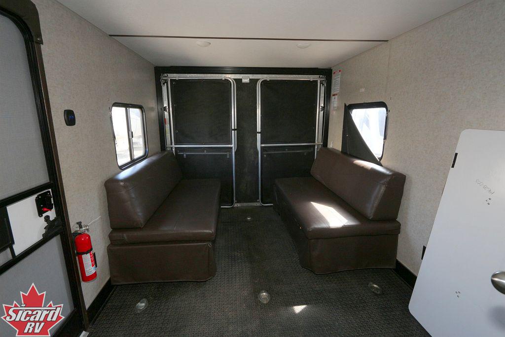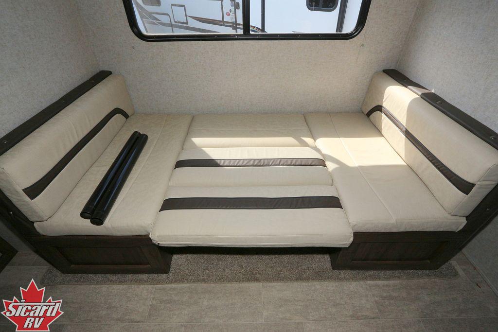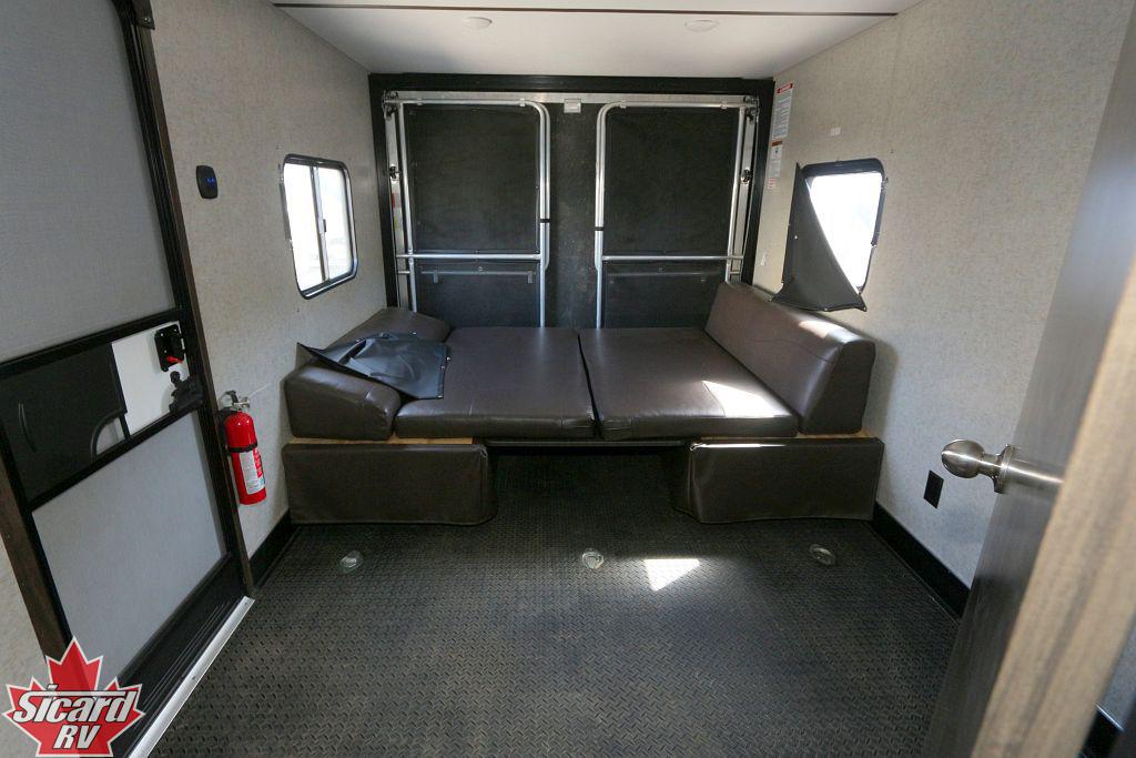 Inside the XLR Micro Boost 27LRLE, you will find a U-shaped bench dinette that converts into a bed providing additional sleeping space when required, as well as a fold up dinette in the rear cargo bay.