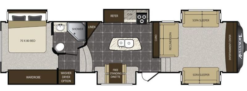 Introducing the 2016 Avalanche 380FL, from Keystone. The Avalanche 380FL will comfortably accommodate you. This fifth wheel sleeps up to 6 people.