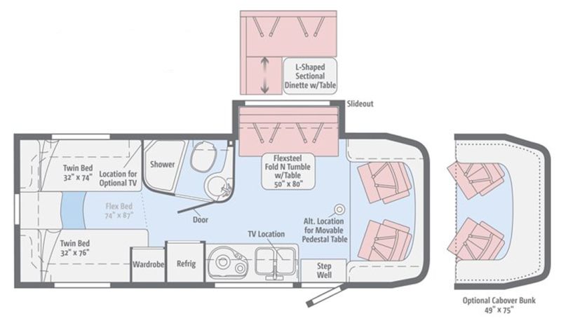 Inside the View 24J, you will find twin beds in the rear that combine into one large sleeping area, as well as a bunk over the front cab.
